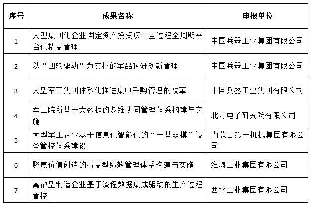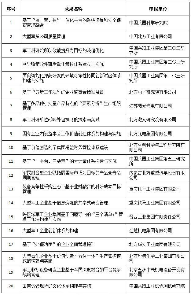 近日,中國兵器工業(yè)集團(tuán)4項(xiàng)創(chuàng)新成果獲全國企業(yè)管理現(xiàn)代化創(chuàng)新成果獎(jiǎng)、42項(xiàng)創(chuàng)新成果獲國防科技工業(yè)企業(yè)管理創(chuàng)新成果獎(jiǎng)。 全國企業(yè)管理現(xiàn)代化創(chuàng)新成果 經(jīng)全國企業(yè)管理現(xiàn)代化創(chuàng)新成果審定委員會(huì)終審,第二十五屆全國企業(yè)管理現(xiàn)代化創(chuàng)新成果公布,中國兵器工業(yè)集團(tuán)4項(xiàng)創(chuàng)新成果榮獲二等獎(jiǎng)。 二等獎(jiǎng) 國防科技工業(yè)企業(yè)管理創(chuàng)新成果 2018年度國防科技工業(yè)企業(yè)管理創(chuàng)新獲獎(jiǎng)成果名單發(fā)布,中國兵器工業(yè)集團(tuán)共獲獎(jiǎng)42項(xiàng),其中:一等獎(jiǎng)7項(xiàng),二等獎(jiǎng)15項(xiàng),三等獎(jiǎng)20項(xiàng)。獲獎(jiǎng)總量及一等獎(jiǎng)數(shù)量均位于軍工集團(tuán)首位。 一等獎(jiǎng) 二等獎(jiǎng) 三等獎(jiǎng) 據(jù)悉,2018年度的國防科技工業(yè)企業(yè)管理創(chuàng)新評審工作,經(jīng)專家初審、函審、一等獎(jiǎng)候選成果答辯、專家會(huì)議評審、評審委員會(huì)審核并公示后,評選出一批在履行強(qiáng)軍首責(zé)、全面貫徹創(chuàng)新驅(qū)動(dòng)發(fā)展戰(zhàn)略和全面深化改革、高質(zhì)量發(fā)展等方面的優(yōu)秀成果。本年度共確定獲獎(jiǎng)成果307項(xiàng),其中一等獎(jiǎng)44項(xiàng),二等獎(jiǎng)126項(xiàng),三等獎(jiǎng)137項(xiàng)。 |