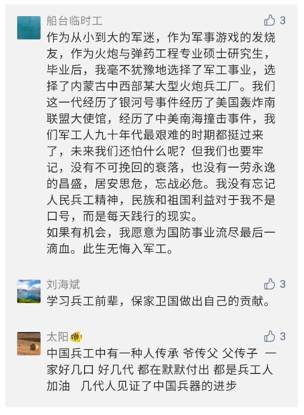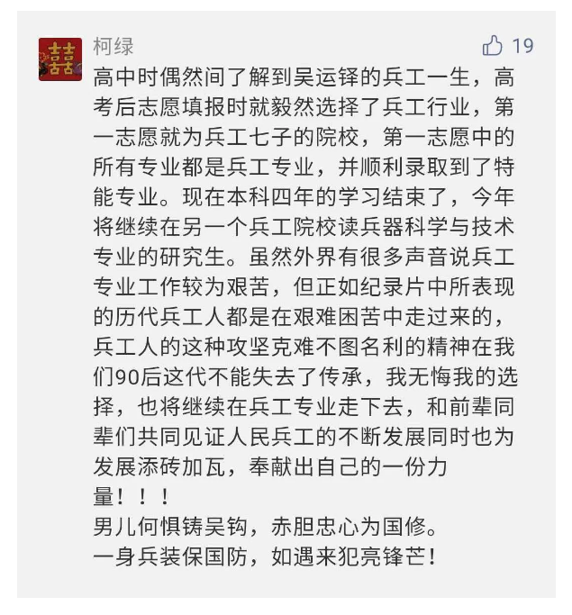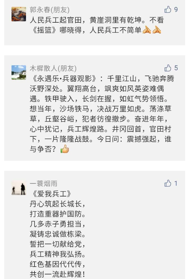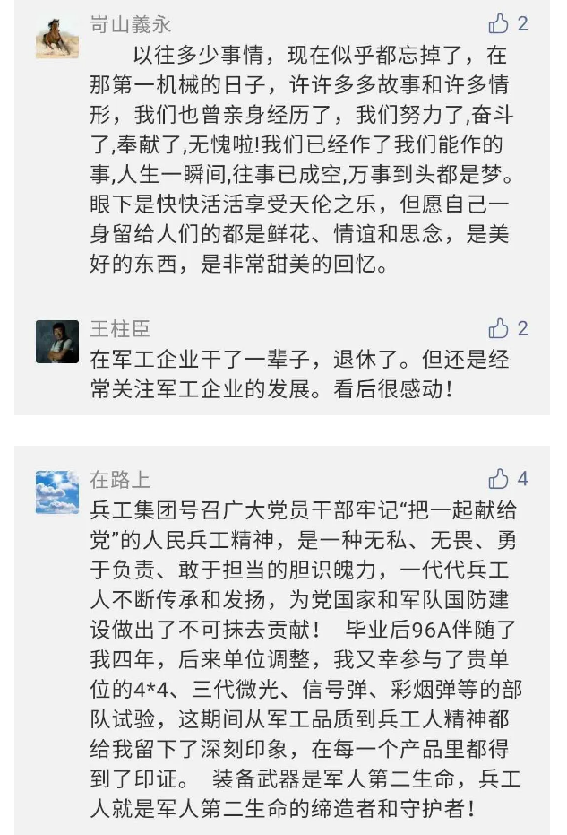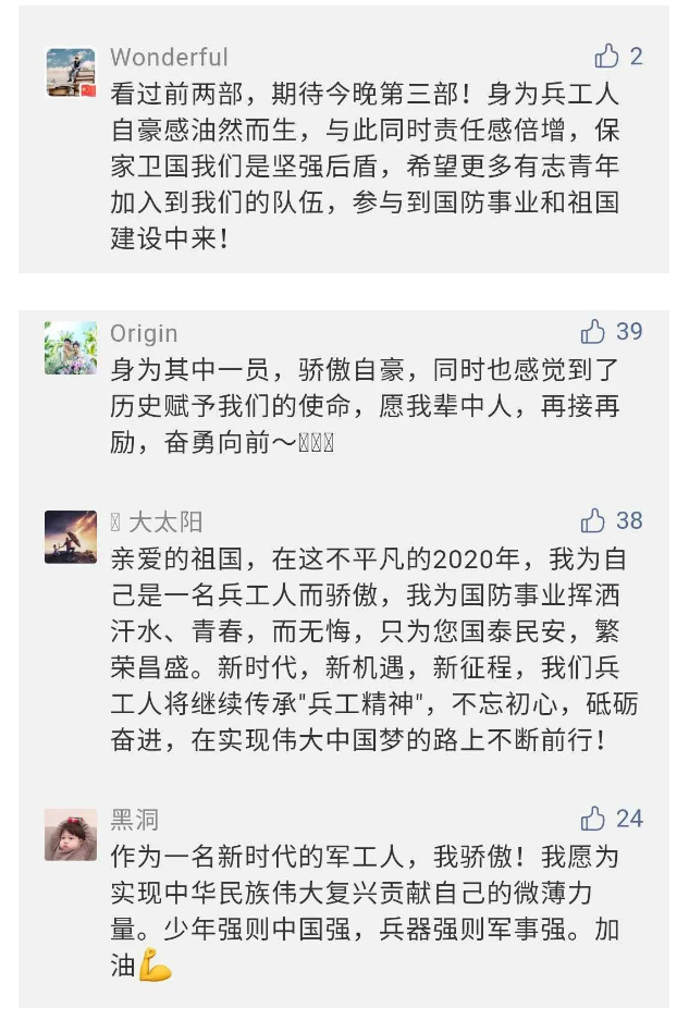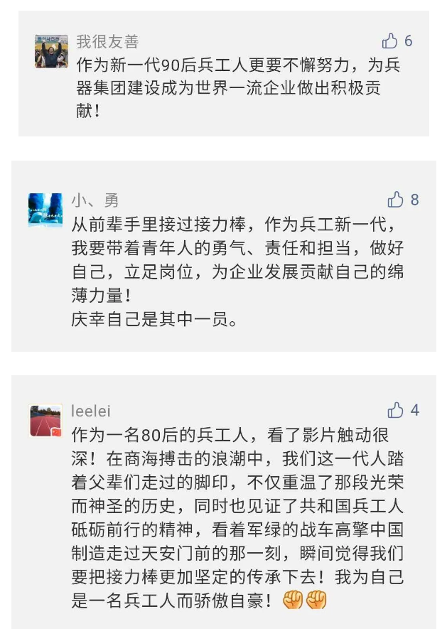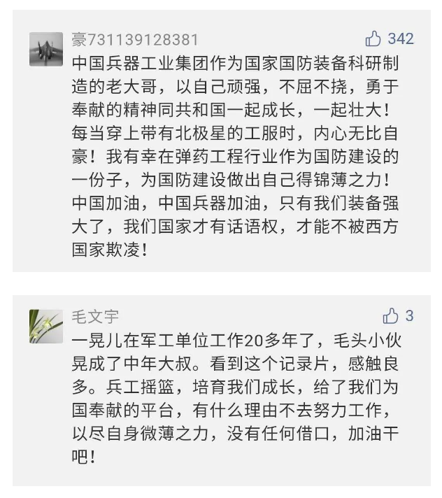 在中國共產(chǎn)黨成立九十九周年之際,由中國兵器工業(yè)集團有限公司組織攝制、反映人民兵工在黨的領(lǐng)導(dǎo)下80余年光輝奮斗歷程、廣大兵工人弘揚“把一切獻給黨”人民兵工精神的三集紀錄片《人民兵工》自7月1日-3日每晚20點在中央廣播電視總臺中文國際頻道(CCTV-4)《國家記憶》首播以來,在兵器系統(tǒng)和觀眾中引發(fā)強烈反響,很多網(wǎng)友、觀眾紛紛留言表達了自己的觀后感受。 觀眾在兵器工業(yè)集團官微的留言區(qū)直抒了觀影感受,有的熱淚盈眶,有的心潮起伏,有的興起賦詩,有的認為讓心靈得到凈化、思想得以提升,有的認為是最直觀的國防教育教材...... 影片勾起了退休老同志無限懷念、兵工人的甜美記憶、攝制期間官田中央兵工廠文化教育基地工作人員的難忘瞬間...... 相比老一輩,年a輕的兵工人也表達了傳承紅色基因,弘揚新時代“把一切獻給黨”的人民兵工精神的豪邁氣概...... 其中也不乏在校的學(xué)生,在感謝英模樹立的榜樣和豐碑的同時,也為自己的職業(yè)生涯定好坐標、做好規(guī)劃,努力前行...... 作為新時代弘揚人民兵工精神的特色文化成果,紀錄片的播出,凝聚起廣大兵器干部職工團結(jié)奮斗新時代磅礴力量,極大的增強了兵工人的自豪感,大家紛紛表達了作為軍工央企一員 “此生無悔入軍工”的使命擔當...... 《人民兵工》共分為三集,分別是《搖籃》《錘煉》《前行》,全景式展示了我們黨領(lǐng)導(dǎo)和創(chuàng)建的第一個軍事工業(yè)部門——人民兵工80余年來從無到有、從小到大、從弱到強的光輝奮斗歷程,生動講述了廣大兵工人聽黨話、跟黨走,大力弘揚“把一切獻給黨”的人民兵工精神,自力更生、艱苦奮斗、開拓進取、無私奉獻的家國情懷和感人事跡。在人民兵工80余年篳路藍縷的奮斗歷程中,涌現(xiàn)出吳運鐸、倪志福、祝榆生等一大批英模人物,在血與火的考驗中凝練形成了“把一切獻給黨”的人民兵工精神,成為人民兵工奮斗不息的紅色基因。(王珊) |