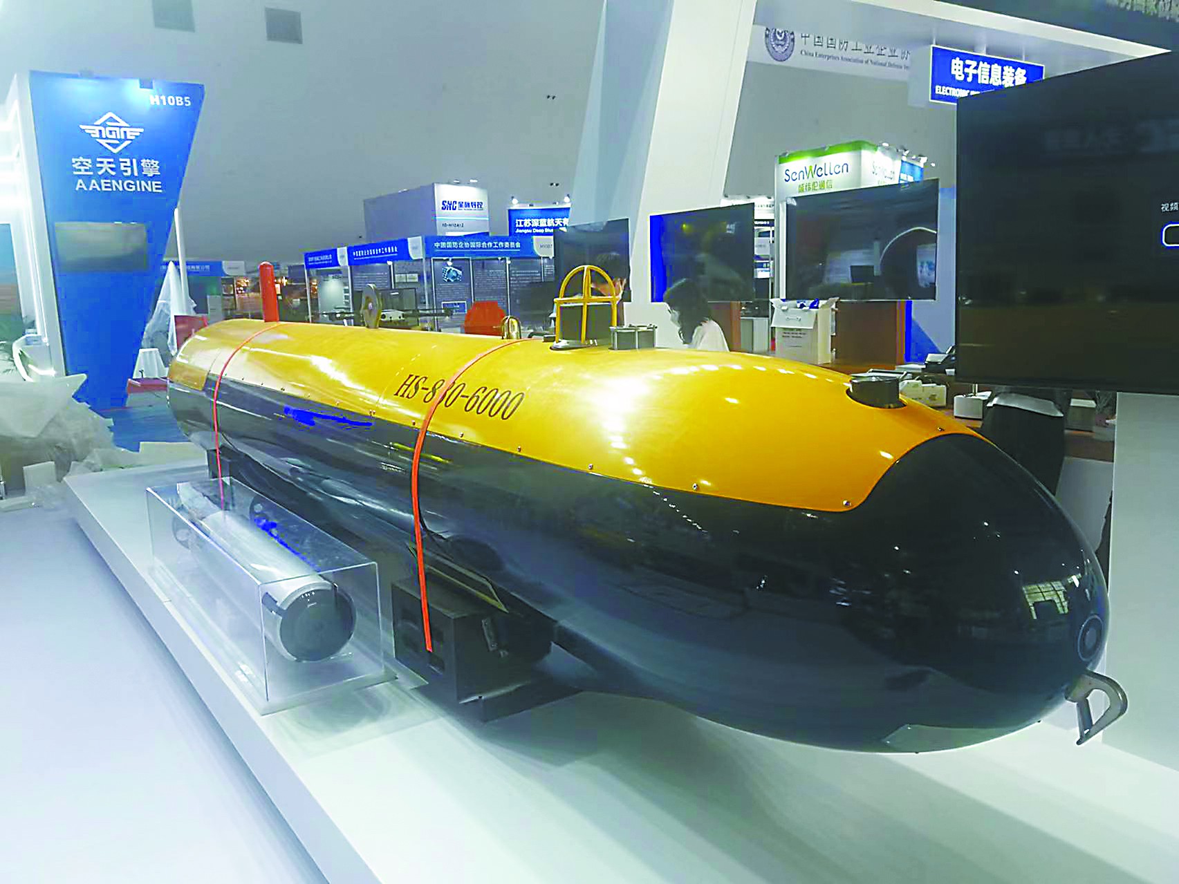 相比公眾相對熟悉的無人機(jī)和無人車,無人船和無人潛航器的知名度略低,但本屆珠海航展上展出的相關(guān)裝備具備相當(dāng)高的水平。例如HS-880-6000型自主式水下航行器(AUV)就是國內(nèi)首型搜救型無人潛航器。它的最大工作深度達(dá)6000米,能以3節(jié)的速度連續(xù)航行24小時,配備有深水遇險目標(biāo)高分辨低照度照明系統(tǒng)、聲信標(biāo)定向引導(dǎo)聲吶、水聲探測側(cè)掃聲吶等,具備工作水深范圍寬、載荷能力大、續(xù)航力長、搜尋探測能力強(qiáng)等特點(diǎn),可對深海目標(biāo)全自主精細(xì)搜尋、探測、定位,執(zhí)行深海水下目標(biāo)搜尋探測和海洋科學(xué)研究任務(wù)。另一款“守望者”無人潛航器個頭小巧,配備有光學(xué)探頭、戰(zhàn)斗部和通信設(shè)備,可以自動靠近水中或海底目標(biāo)進(jìn)行觀測、毀傷目標(biāo),用于執(zhí)行反水雷、排障、海底管道巡檢等任務(wù)。