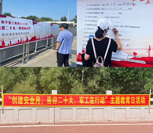 和平重工集團(tuán)在安全生產(chǎn)月期間組織開展了“創(chuàng)建安全月 喜迎二十大 軍工在行動”主題教育日活動,現(xiàn)場懸掛宣傳橫幅標(biāo)語,工作人員為職工們發(fā)放安全知識宣傳冊、扇子等宣傳用品,并在現(xiàn)場組織了安全知識有獎答題環(huán)節(jié),調(diào)動廣大職工參與的積極性,大力營造了“關(guān)愛生命、關(guān)注安全”的良好氛圍。