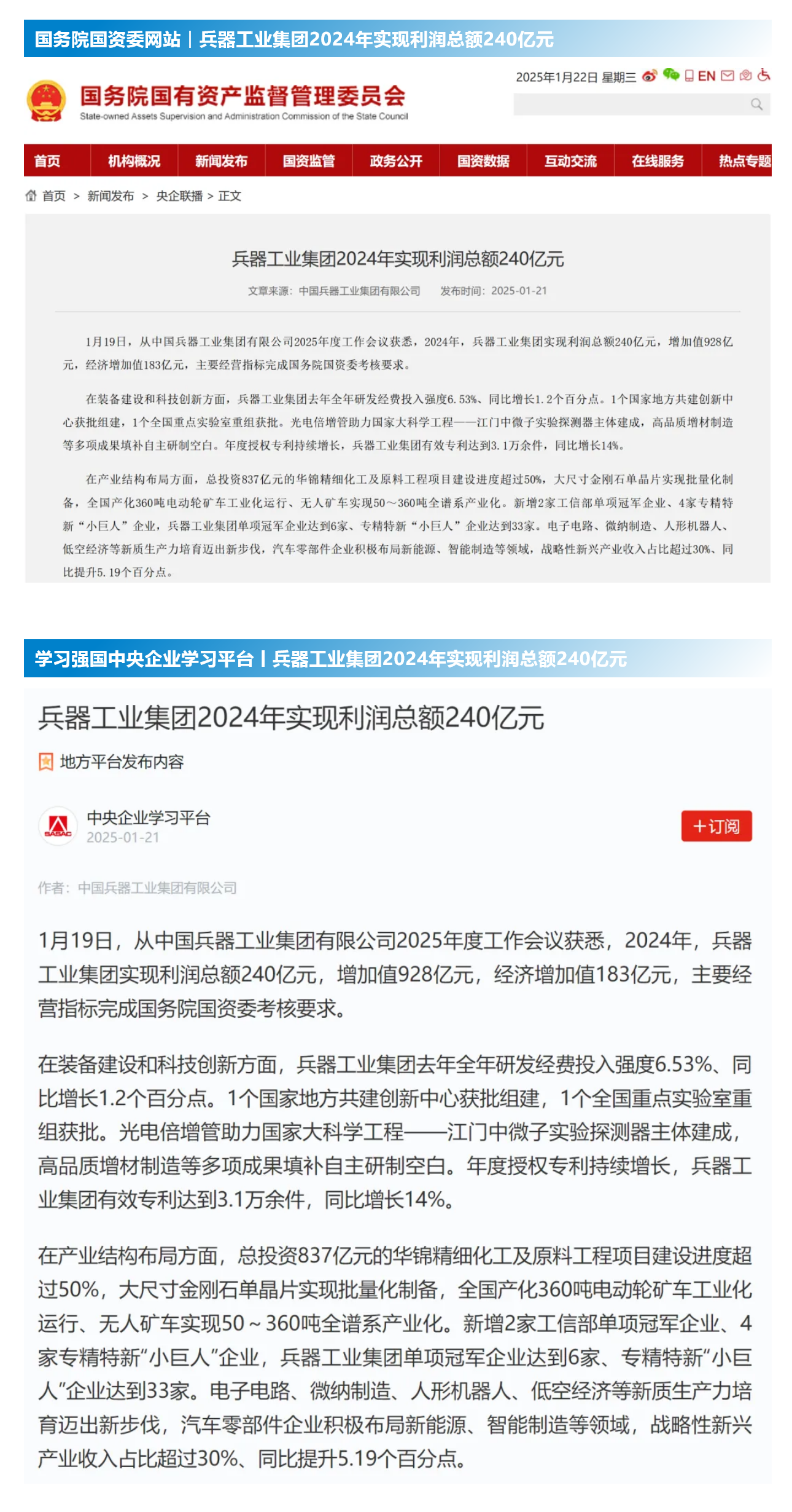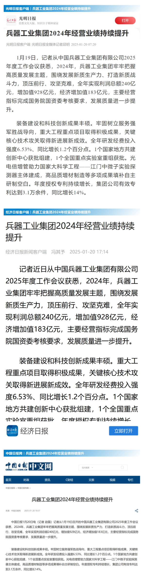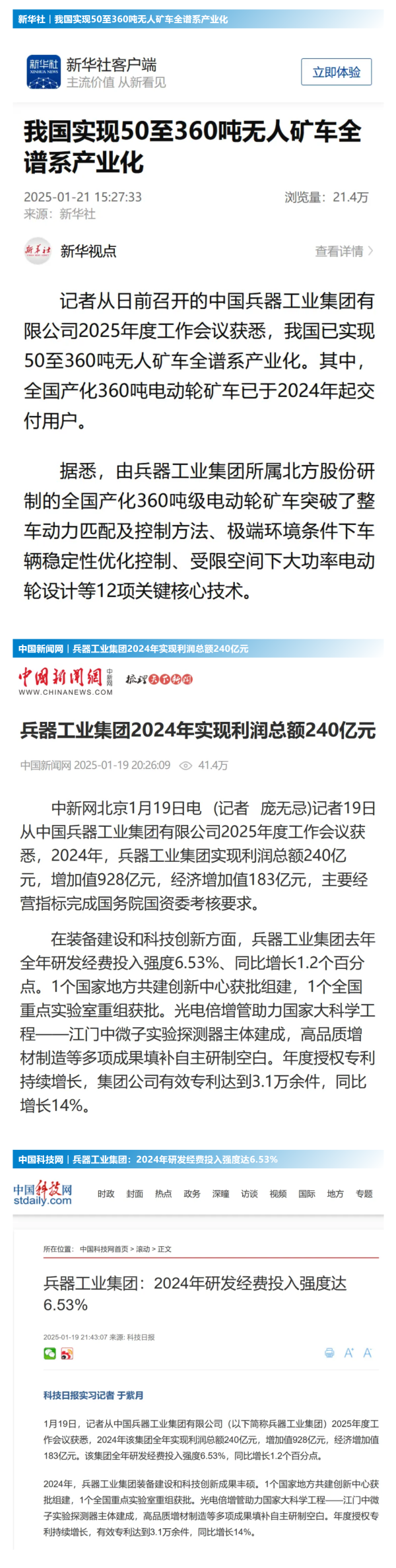 1月19日至20日,中國兵器工業(yè)集團(tuán)有限公司2025年度工作會議在京召開,會議總結(jié)2024年工作,分析形勢任務(wù),明確工作思路,部署2025年工作。 集團(tuán)公司2024年取得的成績及下一步重點(diǎn)工作受到社會媒體廣泛關(guān)注。新華社、中國新聞網(wǎng)、中國科技網(wǎng)、光明日報客戶端、經(jīng)濟(jì)日報客戶端、中國日報網(wǎng)、國務(wù)院國資委網(wǎng)站、學(xué)習(xí)強(qiáng)國中央企業(yè)學(xué)習(xí)平臺、新浪網(wǎng)、網(wǎng)易網(wǎng)、搜狐網(wǎng)、騰訊網(wǎng)、鳳凰網(wǎng)等中央主流媒體、國家部委網(wǎng)站及知名網(wǎng)絡(luò)媒體對集團(tuán)公司2025年度工作會議進(jìn)行了報道,重點(diǎn)關(guān)注集團(tuán)公司經(jīng)營業(yè)績、科技創(chuàng)新、產(chǎn)業(yè)結(jié)構(gòu)布局優(yōu)化等情況。其中,新華社以《我國實現(xiàn)50至360噸無人礦車全譜系產(chǎn)業(yè)化》為題,重點(diǎn)報道了集團(tuán)公司在推動智能制造水平提升方面取得的成效;中國新聞網(wǎng)、光明日報客戶端、經(jīng)濟(jì)日報客戶端、中國日報網(wǎng)等就集團(tuán)公司2024年度經(jīng)營業(yè)績及各項工作取得的成果進(jìn)行報道;中國科技網(wǎng)著重報道了集團(tuán)公司在科技創(chuàng)新和優(yōu)化產(chǎn)業(yè)結(jié)構(gòu)布局方面的最新進(jìn)展。集團(tuán)公司門戶網(wǎng)站、微信公眾號、微博等新媒體平臺以及《中國兵工報》也對集團(tuán)公司工作會議進(jìn)行了及時報道,各成員單位紛紛對相關(guān)內(nèi)容進(jìn)行轉(zhuǎn)載,引發(fā)全系統(tǒng)關(guān)注。