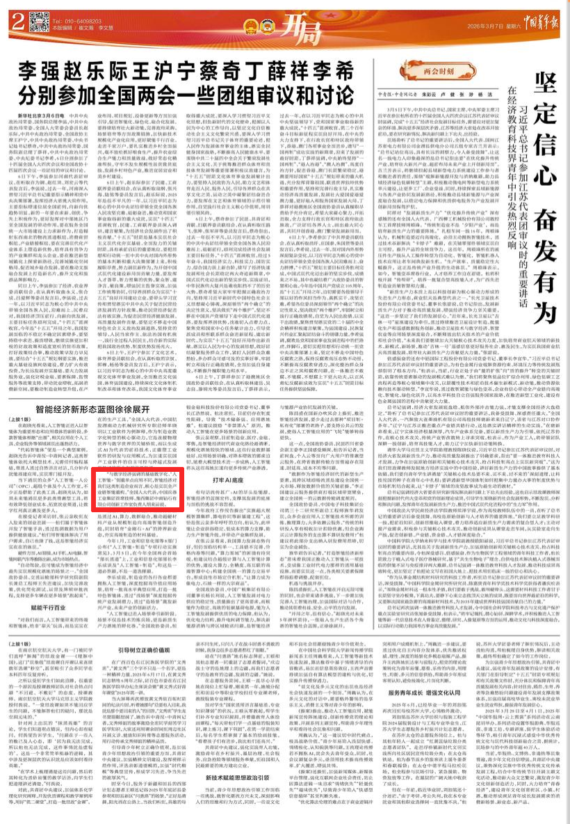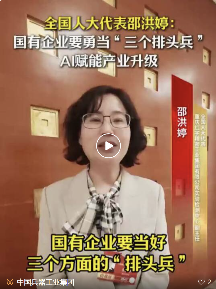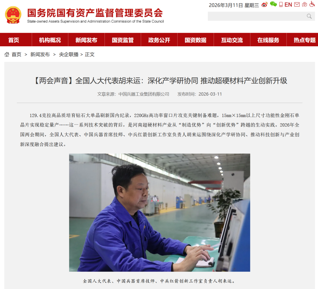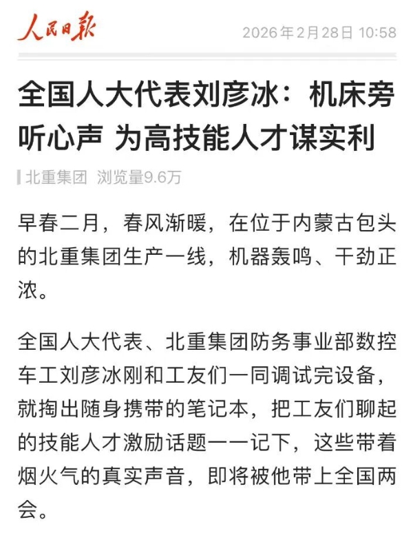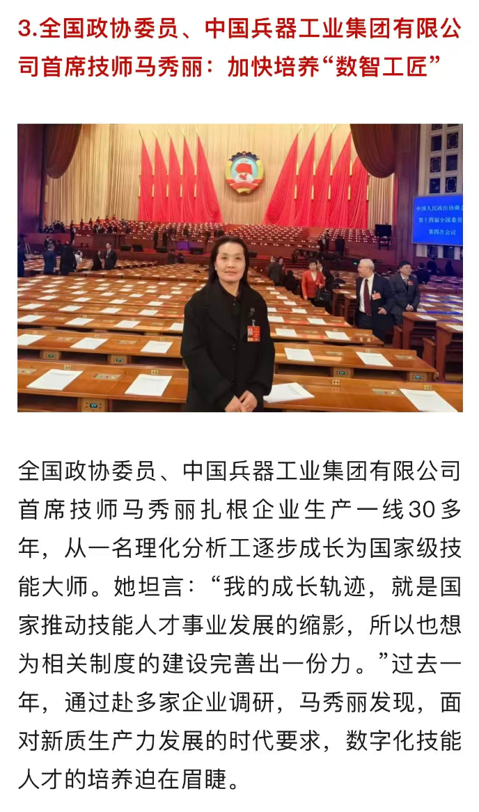全國兩會(huì)期間,人民日?qǐng)?bào)、人民日?qǐng)?bào)客戶端、新華網(wǎng)、央視國防軍事頻道、人民網(wǎng)、新華社客戶端、新華財(cái)經(jīng)、工人日?qǐng)?bào)、中國青年報(bào)、證券時(shí)報(bào)、經(jīng)濟(jì)日?qǐng)?bào)、中國證券報(bào)、人民法院報(bào)、檢察日?qǐng)?bào)、最高人民法院新媒體、國務(wù)院國資委網(wǎng)站、國資小新新媒體等多家中央主流媒體,國家部委所屬報(bào)刊、網(wǎng)站與新媒體,以及內(nèi)蒙古日?qǐng)?bào)、河南日?qǐng)?bào)、湖南日?qǐng)?bào)、河北日?qǐng)?bào)、長治日?qǐng)?bào)等地方媒體對(duì)兵器工業(yè)集團(tuán)全國兩會(huì)代表委員進(jìn)行了采訪報(bào)道。 人民日?qǐng)?bào)采訪報(bào)道北化研究院集團(tuán)慶陽化工馬秀麗、紅宇集團(tuán)邵洪婷 馬秀麗委員——推動(dòng)培養(yǎng)更多“數(shù)智工匠” 新質(zhì)生產(chǎn)力拔節(jié)生長-代表委員熱議 推動(dòng)傳統(tǒng)產(chǎn)業(yè)轉(zhuǎn)型升級(jí),數(shù)字化是重要抓手。我們做產(chǎn)品性能測(cè)試,每一次試驗(yàn)都會(huì)產(chǎn)生大量數(shù)據(jù)。數(shù)字化不僅能提升檢測(cè)效率,還能對(duì)實(shí)驗(yàn)數(shù)據(jù)進(jìn)行結(jié)構(gòu)化處理、系統(tǒng)化管理和關(guān)聯(lián)性挖掘,為產(chǎn)品設(shè)計(jì)提供重要支撐。 ——邵洪婷代表(中國兵器工業(yè)集團(tuán)重慶紅宇精密工業(yè)集團(tuán)有限公司實(shí)驗(yàn)檢測(cè)中心副主任) 人民日?qǐng)?bào)客戶端、經(jīng)濟(jì)日?qǐng)?bào)采訪報(bào)道北重集團(tuán)劉彥冰 人民日?qǐng)?bào)客戶端-全國人大代表劉彥冰:機(jī)床旁聽心聲 為高技能人才謀實(shí)利 經(jīng)濟(jì)日?qǐng)?bào)-劉彥冰代表——加快制造業(yè)數(shù)智轉(zhuǎn)型 新華網(wǎng)、人民法院報(bào)采訪報(bào)道江南工業(yè)集團(tuán)彭小彥 新華網(wǎng)-全國人大代表彭小彥:職業(yè)教育能夠把大國工匠一批批地培養(yǎng)出來 人民法院報(bào)-全國人大代表、中國兵器工業(yè)集團(tuán)有限公司江南工業(yè)集團(tuán)有限公司特級(jí)技師彭小彥:以“司法活水”潤澤企業(yè)發(fā)展沃土 央視國防軍事頻道《正午國防軍事》采訪報(bào)道淮海集團(tuán)王飛 國防科技領(lǐng)域代表委員熱議“十五五”規(guī)劃綱要草案和政府工作報(bào)告 人民網(wǎng)采訪報(bào)道紅宇集團(tuán)邵洪婷 代表委員共話“十五五” 邵洪婷代表:國有企業(yè)要勇當(dāng)“三個(gè)排頭兵” 用AI筑牢產(chǎn)業(yè)根基 新華社客戶端刊發(fā)中光學(xué)李智超的履職故事 全國人大代表、中國兵器首席科技專家李智超:系統(tǒng)布局新技術(shù)應(yīng)用場景 打造科技成果轉(zhuǎn)化“加速器” 新華財(cái)經(jīng)、中國青年報(bào)、證券時(shí)報(bào)、中國證券報(bào)采訪報(bào)道豫西集團(tuán)胡來運(yùn),國務(wù)院國資委網(wǎng)站刊發(fā)胡來運(yùn)的履職故事 新華財(cái)經(jīng)-開局“十五五” 奮“企”向新行|競逐前沿:從技術(shù)突破到產(chǎn)業(yè)重塑 中國青年報(bào)-兩會(huì)新觀察 賦能千行百業(yè) 融入各個(gè)角落 智能經(jīng)濟(jì)新形態(tài)藍(lán)圖徐徐展開 “與數(shù)字經(jīng)濟(jì)強(qiáng)調(diào)的基礎(chǔ)數(shù)字化、‘人工智能+’側(cè)重單點(diǎn)應(yīng)用不同,智能經(jīng)濟(jì)對(duì)我們這類制造企業(yè)而言,核心是實(shí)現(xiàn)全產(chǎn)業(yè)鏈智能重構(gòu)?!比珖舜蟠恚袊鞴I(yè)集團(tuán)首席技師、豫西集團(tuán)中南鉆石有限公司創(chuàng)新工作室負(fù)責(zé)人胡來運(yùn)說。 證券時(shí)報(bào)-全國人大代表、中兵紅箭創(chuàng)新工作室負(fù)責(zé)人胡來運(yùn):深化產(chǎn)學(xué)研協(xié)同 推動(dòng)超硬材料產(chǎn)業(yè)創(chuàng)新升級(jí) 中國證券報(bào)-全國人大代表、中國兵器豫西集團(tuán)中南鉆石公司創(chuàng)新工作室負(fù)責(zé)人胡來運(yùn):做優(yōu)高品質(zhì)培育鉆石 打造全球領(lǐng)先的超硬材料產(chǎn)業(yè)龍頭 國務(wù)院國資委網(wǎng)站-【兩會(huì)聲音】全國人大代表胡來運(yùn):深化產(chǎn)學(xué)研協(xié)同 推動(dòng)超硬材料產(chǎn)業(yè)創(chuàng)新升級(jí) 工人日?qǐng)?bào)采訪報(bào)道江南工業(yè)集團(tuán)彭小彥、北化研究院集團(tuán)慶陽化工馬秀麗 一線代表委員進(jìn)車間、入企業(yè)、訪住戶、聽民聲 凝聚基層智慧,助力“十五五”開好局起好步 “數(shù)智化產(chǎn)線是制造業(yè)升級(jí)的核心載體,人才是產(chǎn)線效能釋放的關(guān)鍵變量?!敝袊鞴I(yè)集團(tuán)有限公司江南工業(yè)集團(tuán)有限公司特級(jí)技師彭小彥代表建議,國家相關(guān)部門在企業(yè)數(shù)智化產(chǎn)線項(xiàng)目申報(bào)中,強(qiáng)制要求企業(yè)提交配套的人才培養(yǎng)方案,明確所需人才的技能等級(jí)、數(shù)量以及培養(yǎng)周期,確保人才培養(yǎng)與產(chǎn)線建設(shè)同步進(jìn)行。 全國政協(xié)總工會(huì)界別委員圍繞政府工作報(bào)告,熱議民生關(guān)切——讓職工“穩(wěn)穩(wěn)的幸?!备斜U?/strong> 中國兵器工業(yè)集團(tuán)首席技師馬秀麗委員結(jié)合自身成長經(jīng)歷建言。她表示,技能人才成長離不開平臺(tái)和社會(huì)重視,要深化產(chǎn)教融合,讓