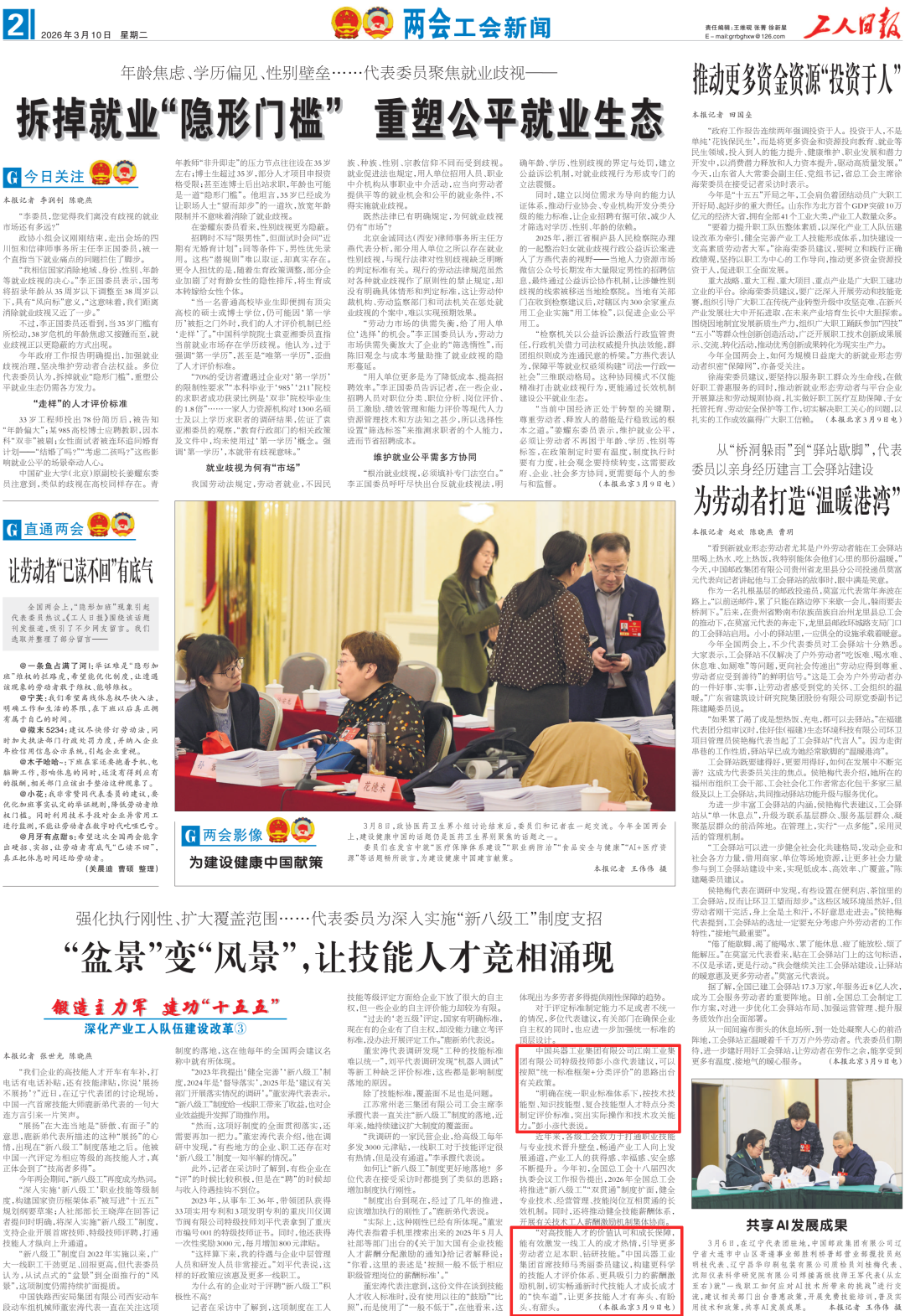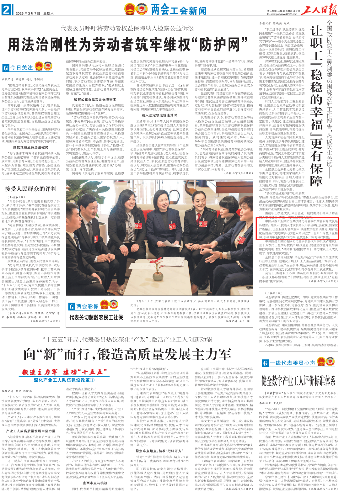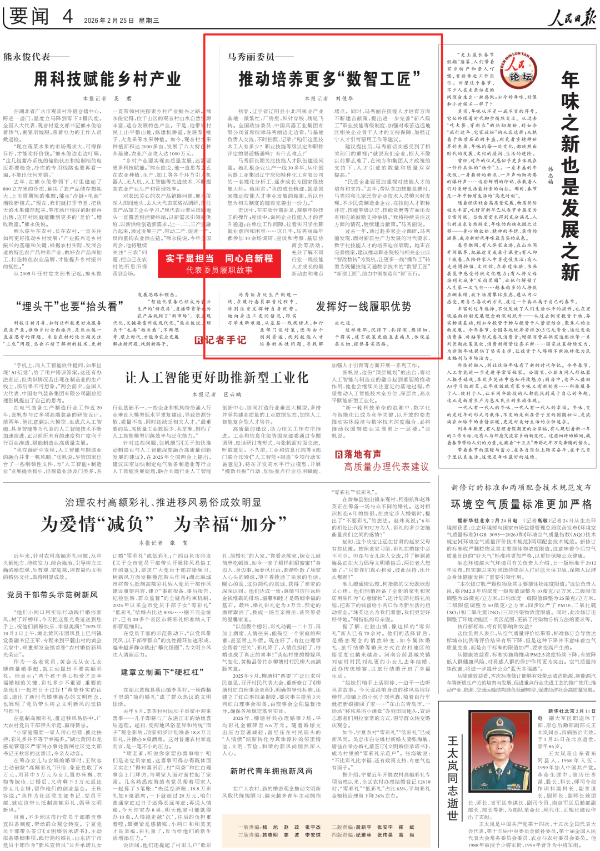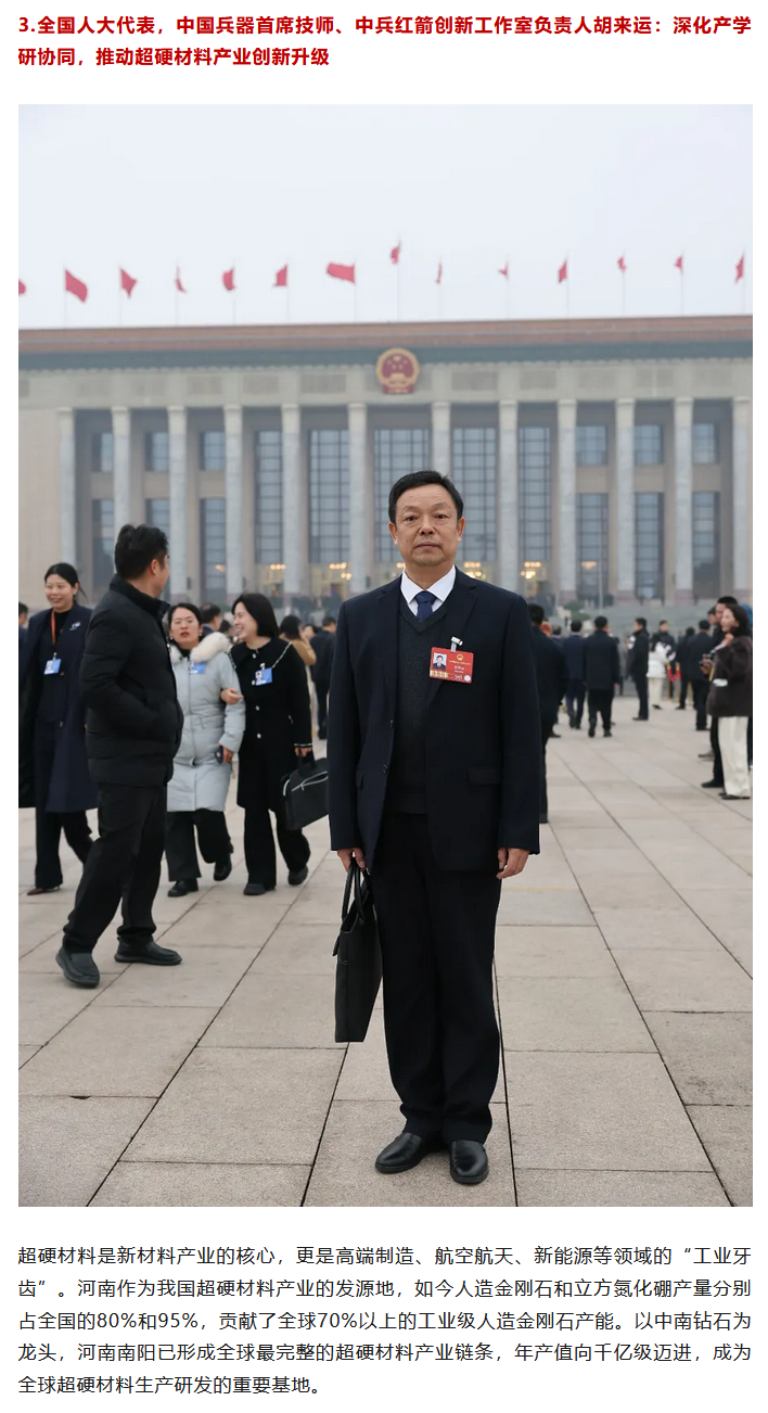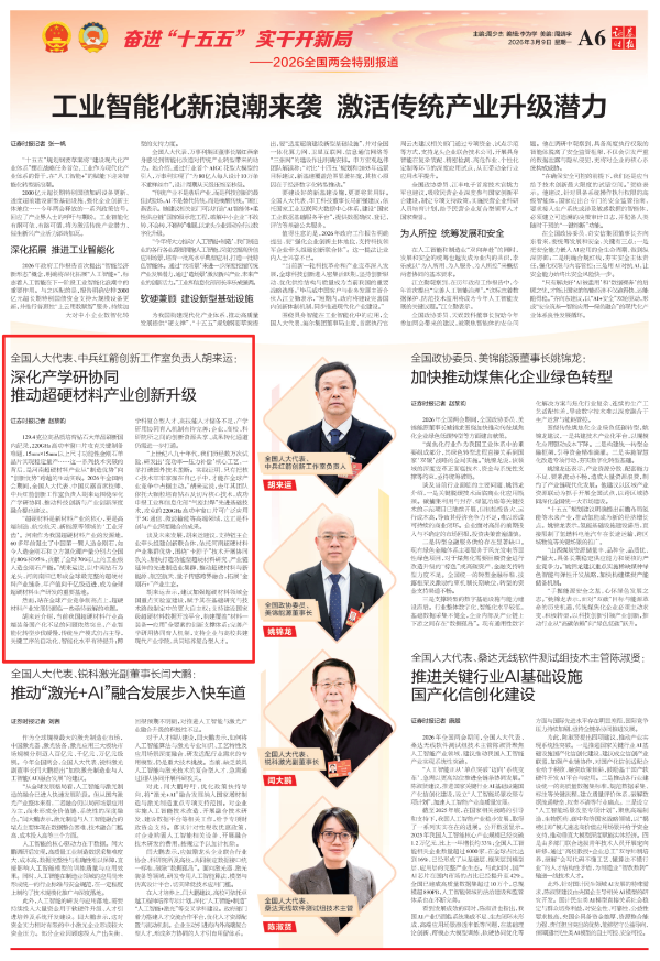 全國兩會(huì)期間,人民日?qǐng)?bào)、人民日?qǐng)?bào)客戶端、新華網(wǎng)、央視國防軍事頻道、人民網(wǎng)、新華社客戶端、新華財(cái)經(jīng)、工人日?qǐng)?bào)、中國青年報(bào)、證券時(shí)報(bào)、經(jīng)濟(jì)日?qǐng)?bào)、中國證券報(bào)、人民法院報(bào)、檢察日?qǐng)?bào)、最高人民法院新媒體、國務(wù)院國資委網(wǎng)站、國資小新新媒體等多家中央主流媒體,國家部委所屬報(bào)刊、網(wǎng)站與新媒體,以及內(nèi)蒙古日?qǐng)?bào)、河南日?qǐng)?bào)、湖南日?qǐng)?bào)、河北日?qǐng)?bào)、長治日?qǐng)?bào)等地方媒體對(duì)兵器工業(yè)集團(tuán)全國兩會(huì)代表委員進(jìn)行了采訪報(bào)道。 人民日?qǐng)?bào)采訪報(bào)道北化研究院集團(tuán)慶陽化工馬秀麗、紅宇集團(tuán)邵洪婷 馬秀麗委員——推動(dòng)培養(yǎng)更多“數(shù)智工匠” 新質(zhì)生產(chǎn)力拔節(jié)生長-代表委員熱議 推動(dòng)傳統(tǒng)產(chǎn)業(yè)轉(zhuǎn)型升級(jí),數(shù)字化是重要抓手。我們做產(chǎn)品性能測(cè)試,每一次試驗(yàn)都會(huì)產(chǎn)生大量數(shù)據(jù)。數(shù)字化不僅能提升檢測(cè)效率,還能對(duì)實(shí)驗(yàn)數(shù)據(jù)進(jìn)行結(jié)構(gòu)化處理、系統(tǒng)化管理和關(guān)聯(lián)性挖掘,為產(chǎn)品設(shè)計(jì)提供重要支撐。 ——邵洪婷代表(中國兵器工業(yè)集團(tuán)重慶紅宇精密工業(yè)集團(tuán)有限公司實(shí)驗(yàn)檢測(cè)中心副主任) 人民日?qǐng)?bào)客戶端、經(jīng)濟(jì)日?qǐng)?bào)采訪報(bào)道北重集團(tuán)劉彥冰 人民日?qǐng)?bào)客戶端-全國人大代表劉彥冰:機(jī)床旁聽心聲 為高技能人才謀實(shí)利 經(jīng)濟(jì)日?qǐng)?bào)-劉彥冰代表——加快制造業(yè)數(shù)智轉(zhuǎn)型 新華網(wǎng)、人民法院報(bào)采訪報(bào)道江南工業(yè)集團(tuán)彭小彥 新華網(wǎng)-全國人大代表彭小彥:職業(yè)教育能夠把大國工匠一批批地培養(yǎng)出來 人民法院報(bào)-全國人大代表、中國兵器工業(yè)集團(tuán)有限公司江南工業(yè)集團(tuán)有限公司特級(jí)技師彭小彥:以“司法活水”潤澤企業(yè)發(fā)展沃土 央視國防軍事頻道《正午國防軍事》采訪報(bào)道淮海集團(tuán)王飛 國防科技領(lǐng)域代表委員熱議“十五五”規(guī)劃綱要草案和政府工作報(bào)告 人民網(wǎng)采訪報(bào)道紅宇集團(tuán)邵洪婷 代表委員共話“十五五” 邵洪婷代表:國有企業(yè)要勇當(dāng)“三個(gè)排頭兵” 用AI筑牢產(chǎn)業(yè)根基 新華社客戶端刊發(fā)中光學(xué)李智超的履職故事 全國人大代表、中國兵器首席科技專家李智超:系統(tǒng)布局新技術(shù)應(yīng)用場景 打造科技成果轉(zhuǎn)化“加速器” 新華財(cái)經(jīng)、中國青年報(bào)、證券時(shí)報(bào)、中國證券報(bào)采訪報(bào)道豫西集團(tuán)胡來運(yùn),國務(wù)院國資委網(wǎng)站刊發(fā)胡來運(yùn)的履職故事 新華財(cái)經(jīng)-開局“十五五” 奮“企”向新行|競逐前沿:從技術(shù)突破到產(chǎn)業(yè)重塑 中國青年報(bào)-兩會(huì)新觀察 賦能千行百業(yè) 融入各個(gè)角落 智能經(jīng)濟(jì)新形態(tài)藍(lán)圖徐徐展開 “與數(shù)字經(jīng)濟(jì)強(qiáng)調(diào)的基礎(chǔ)數(shù)字化、‘人工智能+’側(cè)重單點(diǎn)應(yīng)用不同,智能經(jīng)濟(jì)對(duì)我們這類制造企業(yè)而言,核心是實(shí)現(xiàn)全產(chǎn)業(yè)鏈智能重構(gòu)?!比珖舜蟠恚袊鞴I(yè)集團(tuán)首席技師、豫西集團(tuán)中南鉆石有限公司創(chuàng)新工作室負(fù)責(zé)人胡來運(yùn)說。 證券時(shí)報(bào)-全國人大代表、中兵紅箭創(chuàng)新工作室負(fù)責(zé)人胡來運(yùn):深化產(chǎn)學(xué)研協(xié)同 推動(dòng)超硬材料產(chǎn)業(yè)創(chuàng)新升級(jí) 中國證券報(bào)-全國人大代表、中國兵器豫西集團(tuán)中南鉆石公司創(chuàng)新工作室負(fù)責(zé)人胡來運(yùn):做優(yōu)高品質(zhì)培育鉆石 打造全球領(lǐng)先的超硬材料產(chǎn)業(yè)龍頭 國務(wù)院國資委網(wǎng)站-【兩會(huì)聲音】全國人大代表胡來運(yùn):深化產(chǎn)學(xué)研協(xié)同 推動(dòng)超硬材料產(chǎn)業(yè)創(chuàng)新升級(jí) 工人日?qǐng)?bào)采訪報(bào)道江南工業(yè)集團(tuán)彭小彥、北化研究院集團(tuán)慶陽化工馬秀麗 一線代表委員進(jìn)車間、入企業(yè)、訪住戶、聽民聲 凝聚基層智慧,助力“十五五”開好局起好步 “數(shù)智化產(chǎn)線是制造業(yè)升級(jí)的核心載體,人才是產(chǎn)線效能釋放的關(guān)鍵變量?!敝袊鞴I(yè)集團(tuán)有限公司江南工業(yè)集團(tuán)有限公司特級(jí)技師彭小彥代表建議,國家相關(guān)部門在企業(yè)數(shù)智化產(chǎn)線項(xiàng)目申報(bào)中,強(qiáng)制要求企業(yè)提交配套的人才培養(yǎng)方案,明確所需人才的技能等級(jí)、數(shù)量以及培養(yǎng)周期,確保人才培養(yǎng)與產(chǎn)線建設(shè)同步進(jìn)行。 全國政協(xié)總工會(huì)界別委員圍繞政府工作報(bào)告,熱議民生關(guān)切——讓職工“穩(wěn)穩(wěn)的幸?!备斜U?/strong> 中國兵器工業(yè)集團(tuán)首席技師馬秀麗委員結(jié)合自身成長經(jīng)歷建言。她表示,技能人才成長離不開平臺(tái)和社會(huì)重視,要深化產(chǎn)教融合,讓