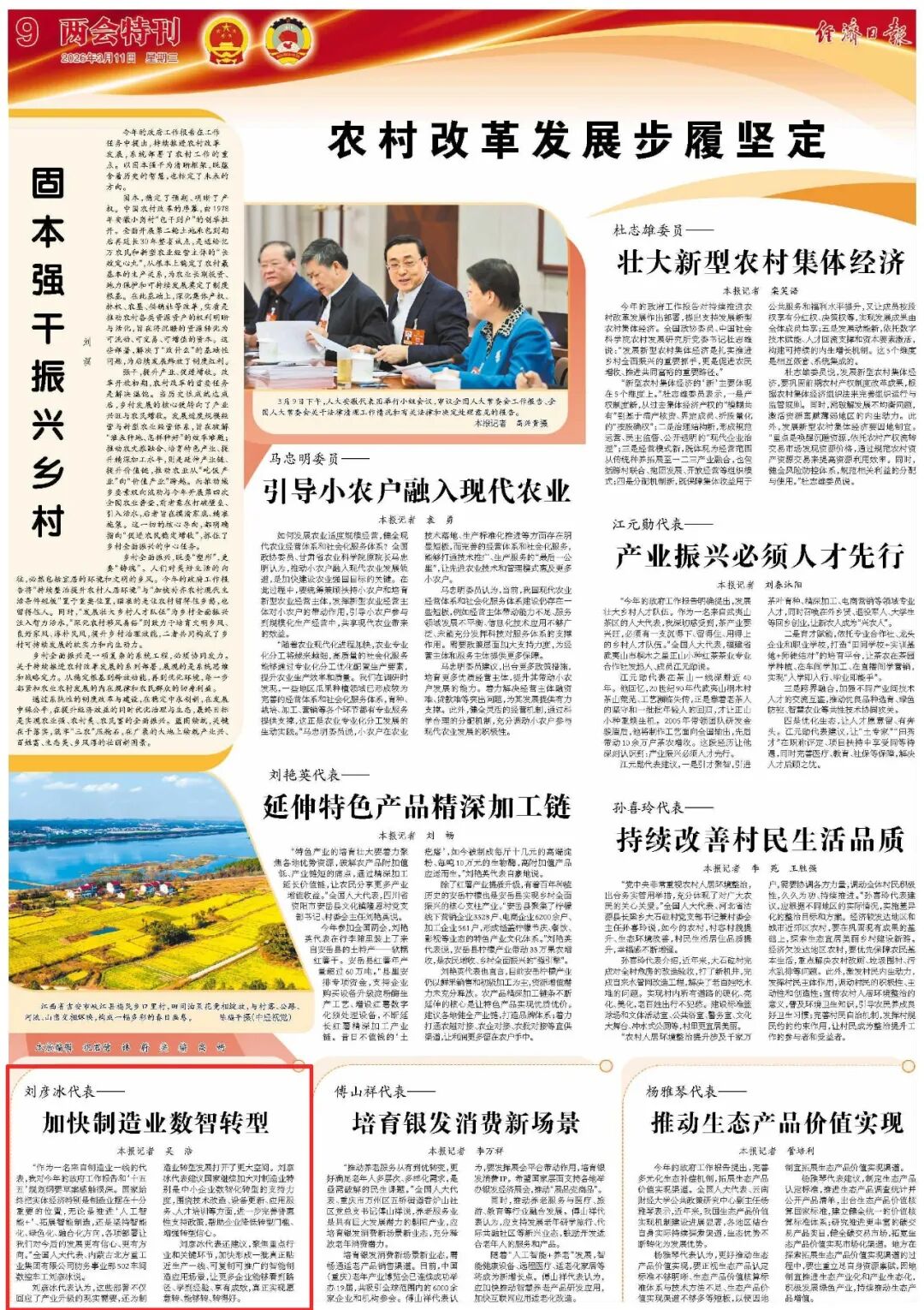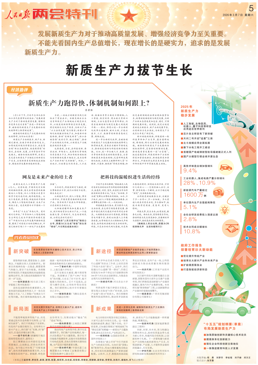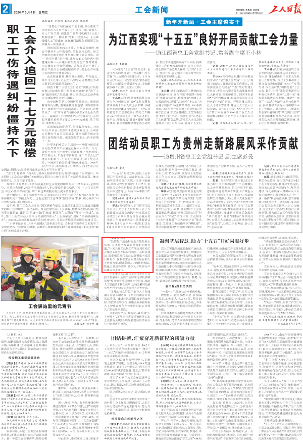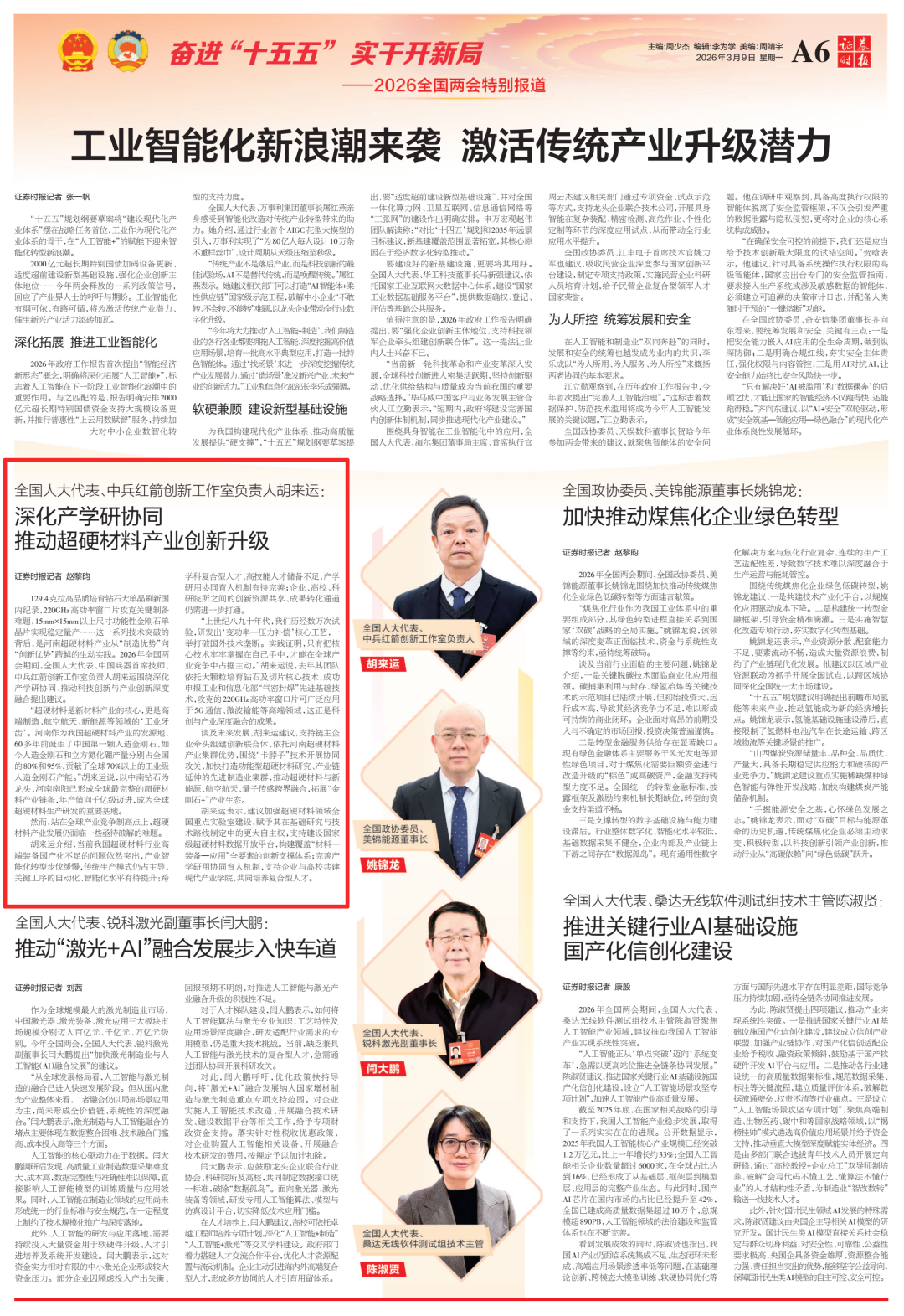 全國兩會(huì)期間,人民日?qǐng)?bào)、人民日?qǐng)?bào)客戶端、新華網(wǎng)、央視國防軍事頻道、人民網(wǎng)、新華社客戶端、新華財(cái)經(jīng)、工人日?qǐng)?bào)、中國青年報(bào)、證券時(shí)報(bào)、經(jīng)濟(jì)日?qǐng)?bào)、中國證券報(bào)、人民法院報(bào)、檢察日?qǐng)?bào)、最高人民法院新媒體、國務(wù)院國資委網(wǎng)站、國資小新新媒體等多家中央主流媒體,國家部委所屬報(bào)刊、網(wǎng)站與新媒體,以及內(nèi)蒙古日?qǐng)?bào)、河南日?qǐng)?bào)、湖南日?qǐng)?bào)、河北日?qǐng)?bào)、長治日?qǐng)?bào)等地方媒體對(duì)兵器工業(yè)集團(tuán)全國兩會(huì)代表委員進(jìn)行了采訪報(bào)道。 人民日?qǐng)?bào)采訪報(bào)道北化研究院集團(tuán)慶陽化工馬秀麗、紅宇集團(tuán)邵洪婷 馬秀麗委員——推動(dòng)培養(yǎng)更多“數(shù)智工匠” 新質(zhì)生產(chǎn)力拔節(jié)生長-代表委員熱議 推動(dòng)傳統(tǒng)產(chǎn)業(yè)轉(zhuǎn)型升級(jí),數(shù)字化是重要抓手。我們做產(chǎn)品性能測(cè)試,每一次試驗(yàn)都會(huì)產(chǎn)生大量數(shù)據(jù)。數(shù)字化不僅能提升檢測(cè)效率,還能對(duì)實(shí)驗(yàn)數(shù)據(jù)進(jìn)行結(jié)構(gòu)化處理、系統(tǒng)化管理和關(guān)聯(lián)性挖掘,為產(chǎn)品設(shè)計(jì)提供重要支撐。 ——邵洪婷代表(中國兵器工業(yè)集團(tuán)重慶紅宇精密工業(yè)集團(tuán)有限公司實(shí)驗(yàn)檢測(cè)中心副主任) 人民日?qǐng)?bào)客戶端、經(jīng)濟(jì)日?qǐng)?bào)采訪報(bào)道北重集團(tuán)劉彥冰 人民日?qǐng)?bào)客戶端-全國人大代表劉彥冰:機(jī)床旁聽心聲 為高技能人才謀實(shí)利 經(jīng)濟(jì)日?qǐng)?bào)-劉彥冰代表——加快制造業(yè)數(shù)智轉(zhuǎn)型 新華網(wǎng)、人民法院報(bào)采訪報(bào)道江南工業(yè)集團(tuán)彭小彥 新華網(wǎng)-全國人大代表彭小彥:職業(yè)教育能夠把大國工匠一批批地培養(yǎng)出來 人民法院報(bào)-全國人大代表、中國兵器工業(yè)集團(tuán)有限公司江南工業(yè)集團(tuán)有限公司特級(jí)技師彭小彥:以“司法活水”潤澤企業(yè)發(fā)展沃土 央視國防軍事頻道《正午國防軍事》采訪報(bào)道淮海集團(tuán)王飛 國防科技領(lǐng)域代表委員熱議“十五五”規(guī)劃綱要草案和政府工作報(bào)告 人民網(wǎng)采訪報(bào)道紅宇集團(tuán)邵洪婷 代表委員共話“十五五” 邵洪婷代表:國有企業(yè)要勇當(dāng)“三個(gè)排頭兵” 用AI筑牢產(chǎn)業(yè)根基 新華社客戶端刊發(fā)中光學(xué)李智超的履職故事 全國人大代表、中國兵器首席科技專家李智超:系統(tǒng)布局新技術(shù)應(yīng)用場景 打造科技成果轉(zhuǎn)化“加速器” 新華財(cái)經(jīng)、中國青年報(bào)、證券時(shí)報(bào)、中國證券報(bào)采訪報(bào)道豫西集團(tuán)胡來運(yùn),國務(wù)院國資委網(wǎng)站刊發(fā)胡來運(yùn)的履職故事 新華財(cái)經(jīng)-開局“十五五” 奮“企”向新行|競逐前沿:從技術(shù)突破到產(chǎn)業(yè)重塑 中國青年報(bào)-兩會(huì)新觀察 賦能千行百業(yè) 融入各個(gè)角落 智能經(jīng)濟(jì)新形態(tài)藍(lán)圖徐徐展開 “與數(shù)字經(jīng)濟(jì)強(qiáng)調(diào)的基礎(chǔ)數(shù)字化、‘人工智能+’側(cè)重單點(diǎn)應(yīng)用不同,智能經(jīng)濟(jì)對(duì)我們這類制造企業(yè)而言,核心是實(shí)現(xiàn)全產(chǎn)業(yè)鏈智能重構(gòu)?!比珖舜蟠恚袊鞴I(yè)集團(tuán)首席技師、豫西集團(tuán)中南鉆石有限公司創(chuàng)新工作室負(fù)責(zé)人胡來運(yùn)說。 證券時(shí)報(bào)-全國人大代表、中兵紅箭創(chuàng)新工作室負(fù)責(zé)人胡來運(yùn):深化產(chǎn)學(xué)研協(xié)同 推動(dòng)超硬材料產(chǎn)業(yè)創(chuàng)新升級(jí) 中國證券報(bào)-全國人大代表、中國兵器豫西集團(tuán)中南鉆石公司創(chuàng)新工作室負(fù)責(zé)人胡來運(yùn):做優(yōu)高品質(zhì)培育鉆石 打造全球領(lǐng)先的超硬材料產(chǎn)業(yè)龍頭 國務(wù)院國資委網(wǎng)站-【兩會(huì)聲音】全國人大代表胡來運(yùn):深化產(chǎn)學(xué)研協(xié)同 推動(dòng)超硬材料產(chǎn)業(yè)創(chuàng)新升級(jí) 工人日?qǐng)?bào)采訪報(bào)道江南工業(yè)集團(tuán)彭小彥、北化研究院集團(tuán)慶陽化工馬秀麗 一線代表委員進(jìn)車間、入企業(yè)、訪住戶、聽民聲 凝聚基層智慧,助力“十五五”開好局起好步 “數(shù)智化產(chǎn)線是制造業(yè)升級(jí)的核心載體,人才是產(chǎn)線效能釋放的關(guān)鍵變量?!敝袊鞴I(yè)集團(tuán)有限公司江南工業(yè)集團(tuán)有限公司特級(jí)技師彭小彥代表建議,國家相關(guān)部門在企業(yè)數(shù)智化產(chǎn)線項(xiàng)目申報(bào)中,強(qiáng)制要求企業(yè)提交配套的人才培養(yǎng)方案,明確所需人才的技能等級(jí)、數(shù)量以及培養(yǎng)周期,確保人才培養(yǎng)與產(chǎn)線建設(shè)同步進(jìn)行。 全國政協(xié)總工會(huì)界別委員圍繞政府工作報(bào)告,熱議民生關(guān)切——讓職工“穩(wěn)穩(wěn)的幸?!备斜U?/strong> 中國兵器工業(yè)集團(tuán)首席技師馬秀麗委員結(jié)合自身成長經(jīng)歷建言。她表示,技能人才成長離不開平臺(tái)和社會(huì)重視,要深化產(chǎn)教融合,讓